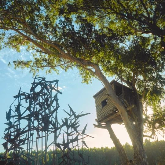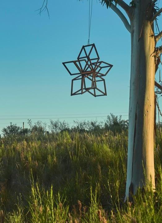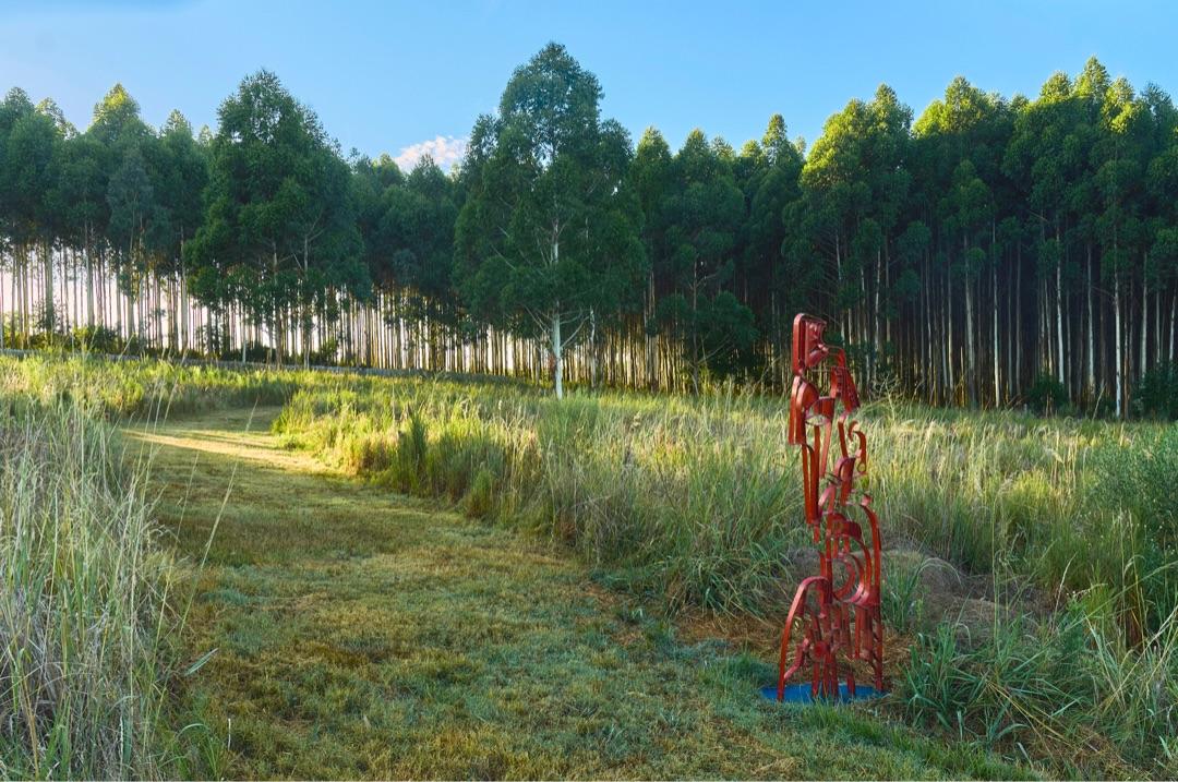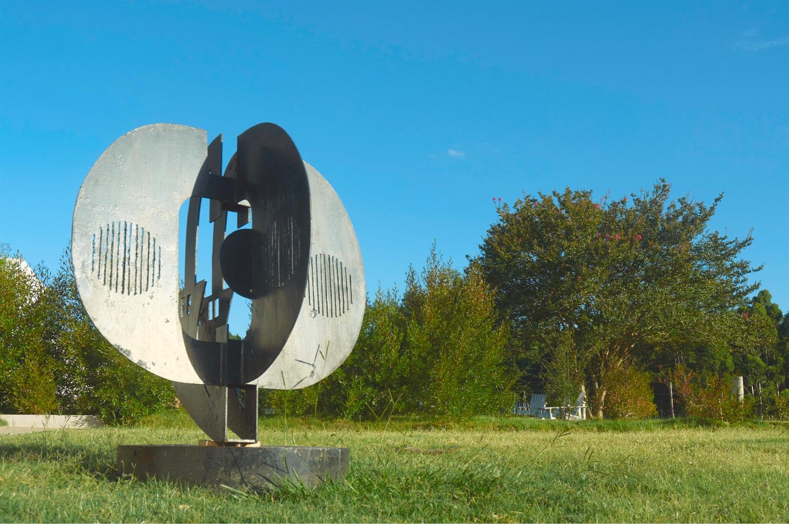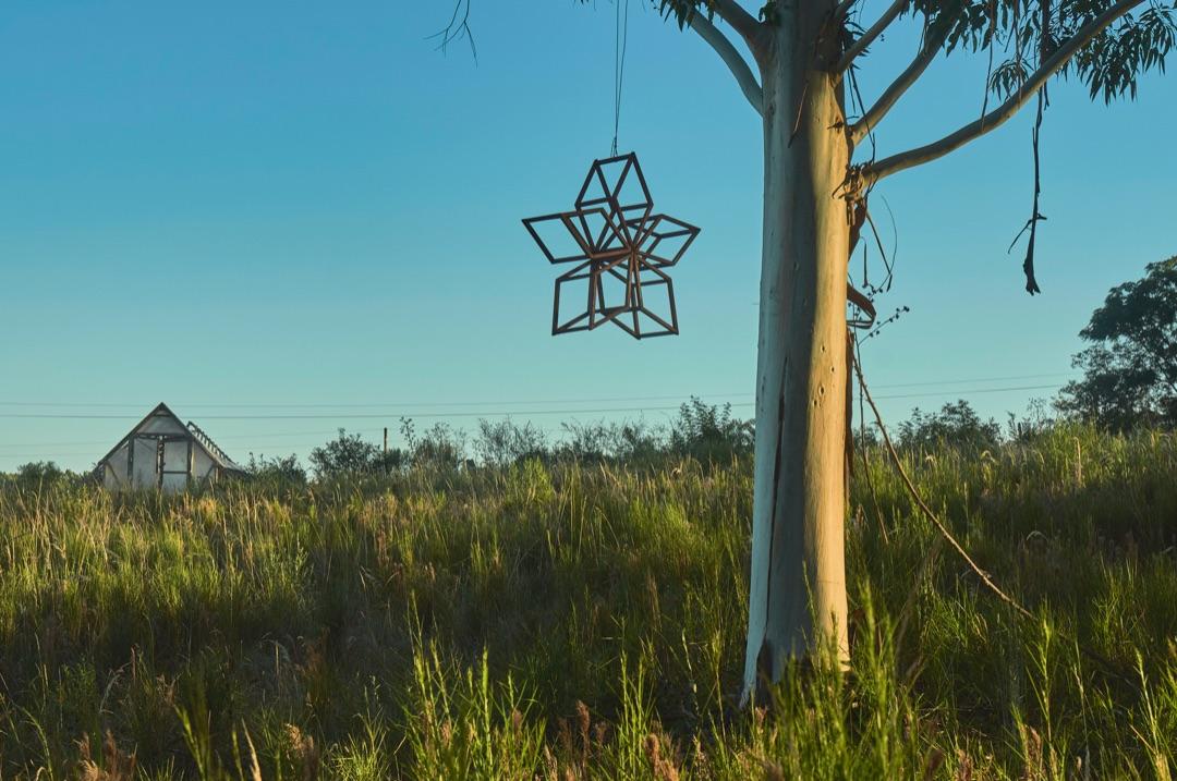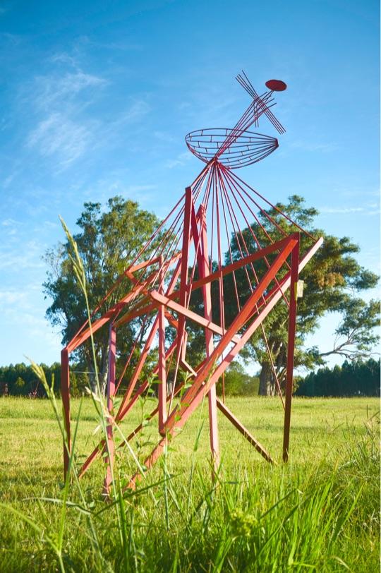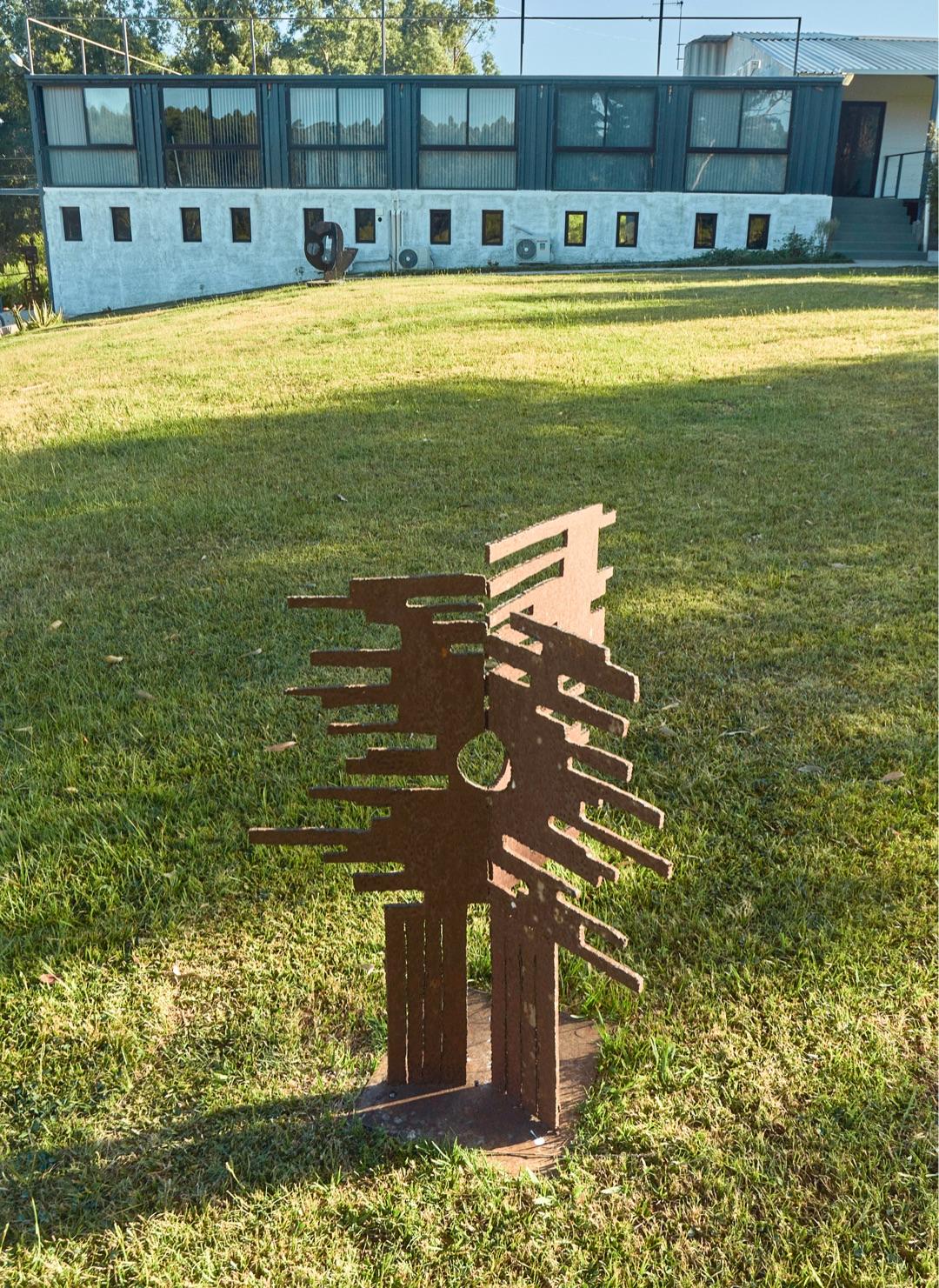 Humor, sátira, y un afán por el aprovechamiento del descarte conviven en esculturas ensambladas a partir de diversos materiales desechados o encontrados, como un inmenso “Frankenstein” que descansa entre bambusales, compuesto de láminas de latas recicladas formando capas epidérmicas. Otras figuras autoportantes habitan en el jardín de La Garúa: una máquina de escribir oxidada cuyas teclas saltan de sus soportes como toboganes para duendes; una figura de estatura humana compuesta enteramente por piezas auto-mecánicas como discos de embragues, tornillos, cilindros y correas metálicas; un pedestal de ruedas de bicicleta coronado por un manillar de acero. Varias de estas piezas nos recuerdan ensamblajes dadaístas así como las primeras esculturas y readymades de Marcel Duchamp.