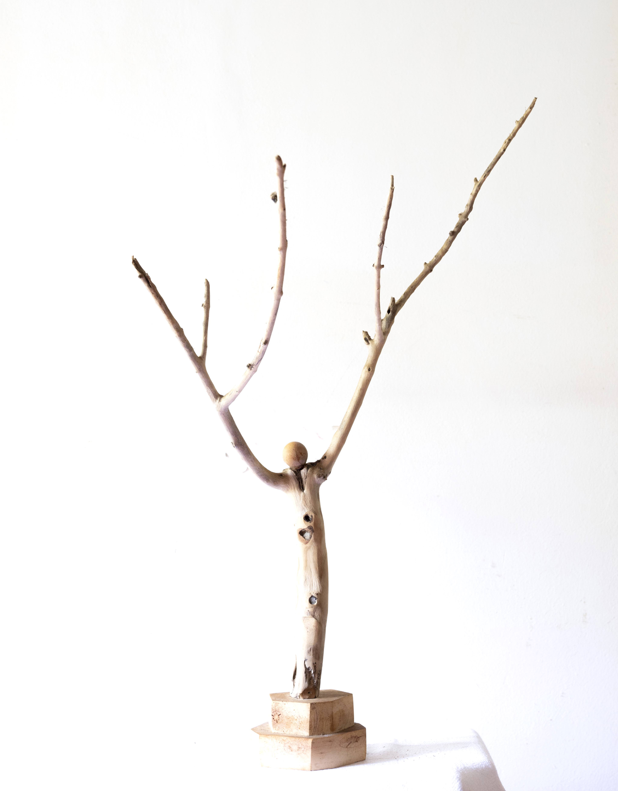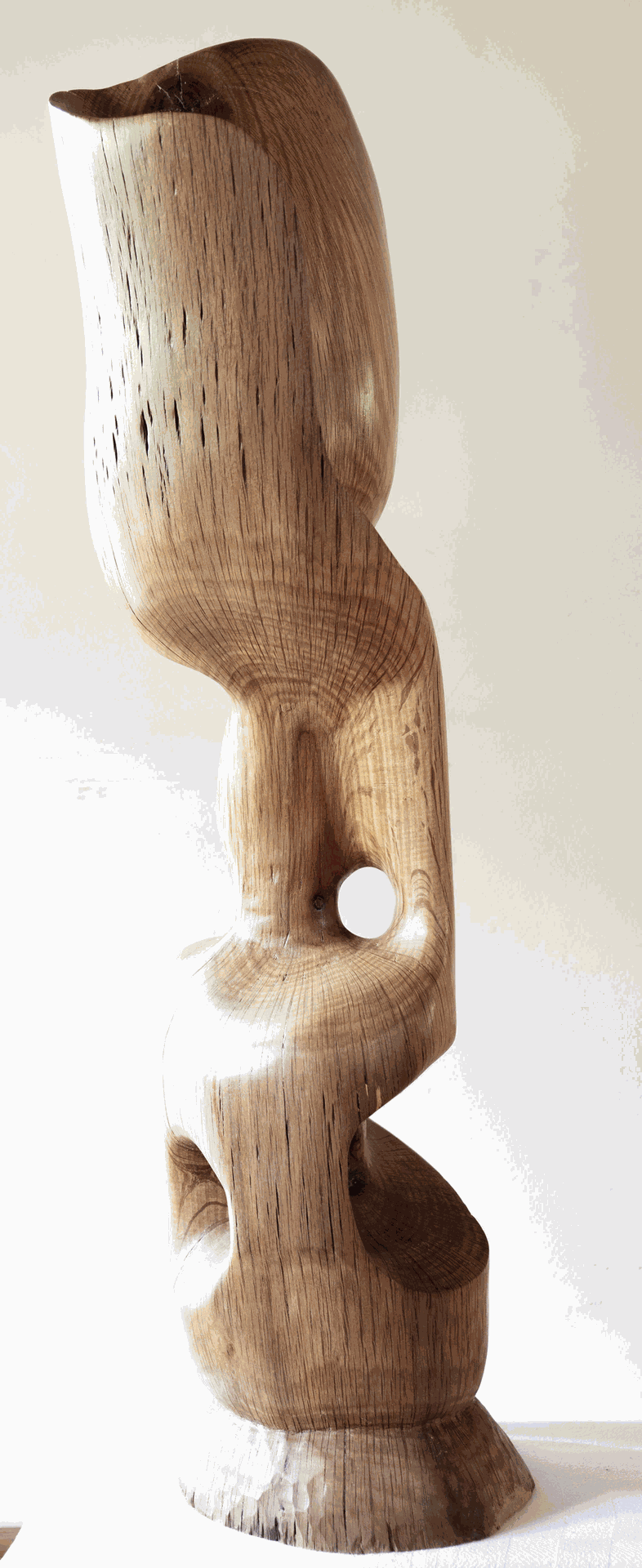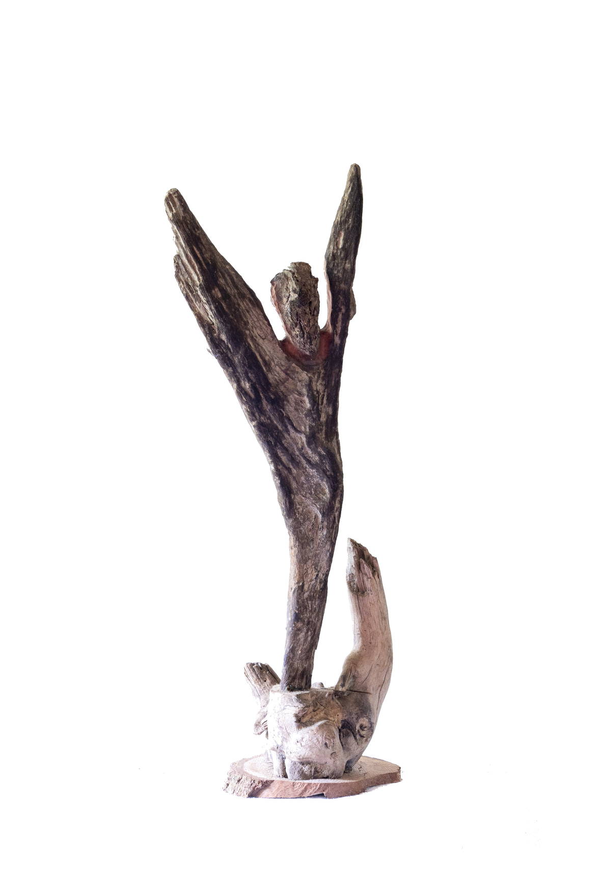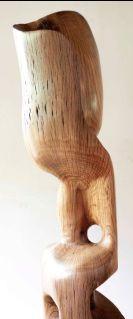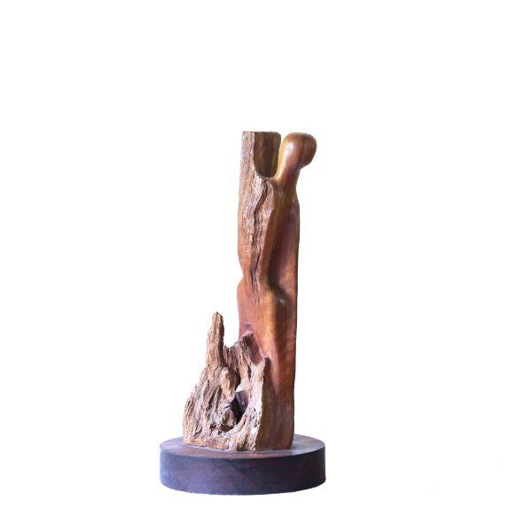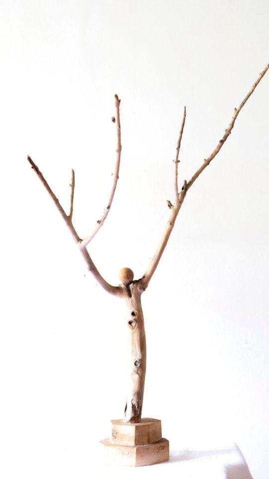 Su fusión con la naturaleza se manifiesta claramente en el conjunto de obras que titulamos “Figuras encontradas”. En estas esculturas Solum se coloca en el lugar de un facilitador expresivo de un escultor previo – que en este caso sería Dios, o la naturaleza misma metamorfoseada por el paso del tiempo. Cada una de estas esculturas alude a una forma reconocible cuando imbuida por nuestro “imaginario humano”, y sin embargo no deja de ser un pedazo de rama o tronco u algo similar de madera encontrado a la deriva en algún paseo por la playa o el campo. A la vez, contienen y logran evocar una potencia expresiva en muchos casos verdaderamente conmovedora: una bailarina que nos recuerda los pasteles de Degas, un tríptico de “humanoides” sin rostros ni identidad acudiendo a algo sublime; un hombre bailando con un árbol como Frank Sinatra en Singing in the Rain, una reina o faraón sentada en su trono silenciado por los siglos, el rostro de Munch sin cuerpo y sin boca, un atleta que corre con los brazos abiertos…