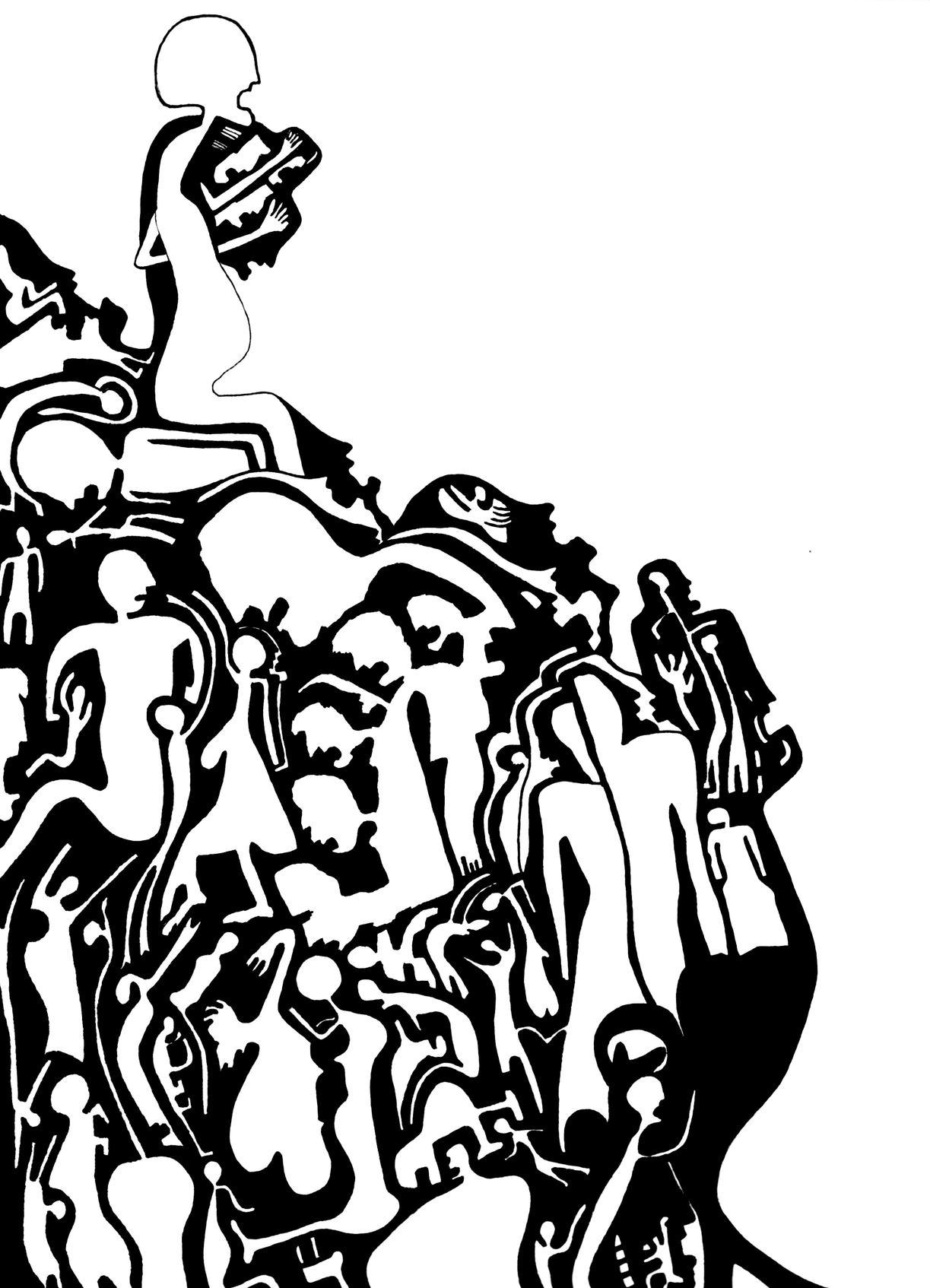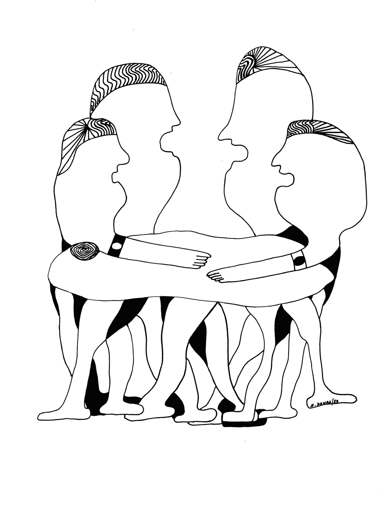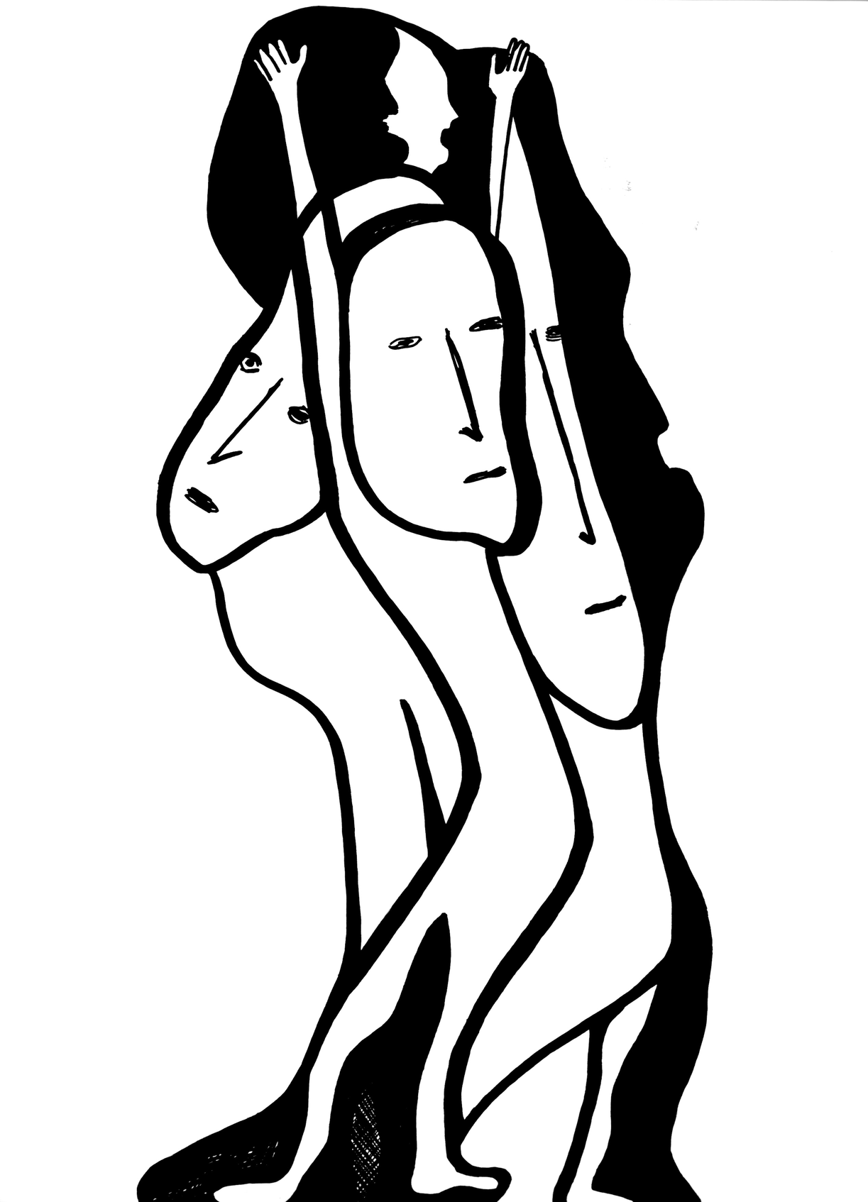 Hay motivos que se repiten de manera consistente a través del tiempo: mujeres con las cabezas cubiertas por un lienzo, medias lunas, figuras sin rostro fundiéndose unas en las otras como cintas Möebius atravesando el adentro y afuera de sus volúmenes y espacios. Espacios positivos y negativos, luz y sombra.