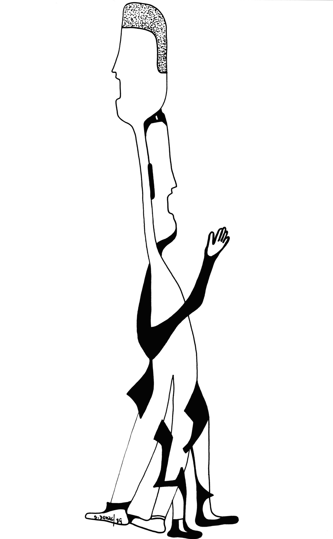 Paralelamente a las demás investigaciones escultóricas, Donas produce de manera prolífica piezas autoportantes sobre bases de madera que dialogan directamente con los dibujos de las formas que él denominaba “humanoides”. Son figuras antropomórficas que se encuentran en un límite entre lo figurativo y lo abstracto que bailan, se multiplican y brotan verticalmente como si buscaran una conexión con la atmósfera. El ser humano y la naturaleza están íntimamente conectados en su producción, especialmente en toda su obra en madera. En ese sentido, las obras con motivos más ornamentales también parecen prestarle un homenaje a la naturaleza: explora texturas en las superficies buscando o encontrando ecos con los orígenes del árbol, su relación con las plantas, el fruto, la semilla, el tallo, el surco y la espiral.