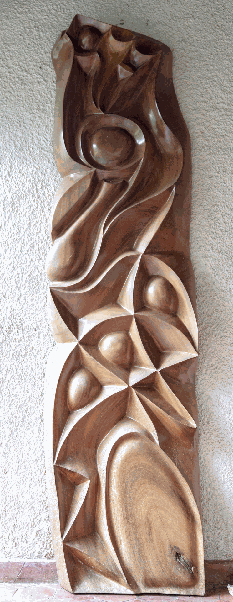 Ambos los relieves y las esculturas autoportantes demuestran una pulsión absolutamente sensorial – la experiencia escultórica para Donas proviene de una necesidad vital de conectarse con la materia de manera física abarcando todos los sentidos. Son respuestas sensibles y empáticas del escultor hacia la materia prima. La madera costa ricense le habla, y él escucha, siente, y sigue sus vetas conductoras. Es de esa manera empática e intuitiva que Solum ha podido trabajar en un universo abstracto durante dos décadas, sin elaborar o seguir teorías del arte abstracto formuladas a lo largo de todo el siglo XX en la historia del arte occidental. Entre una obra y otra conversa con artistas como Duchamp, Picasso, Klee, Miró, Calder, Magritte, Dali, Henry Moore, algunos de los tantos creadores que lo fueron acompañando y poblando otra importante colección del artista: su biblioteca de arte. Pero su abstracción es absolutamente personal y orgánica, resultado y resumen de su pasaje por América Latina, y por una existencia dedicada a la salud del ser humano.