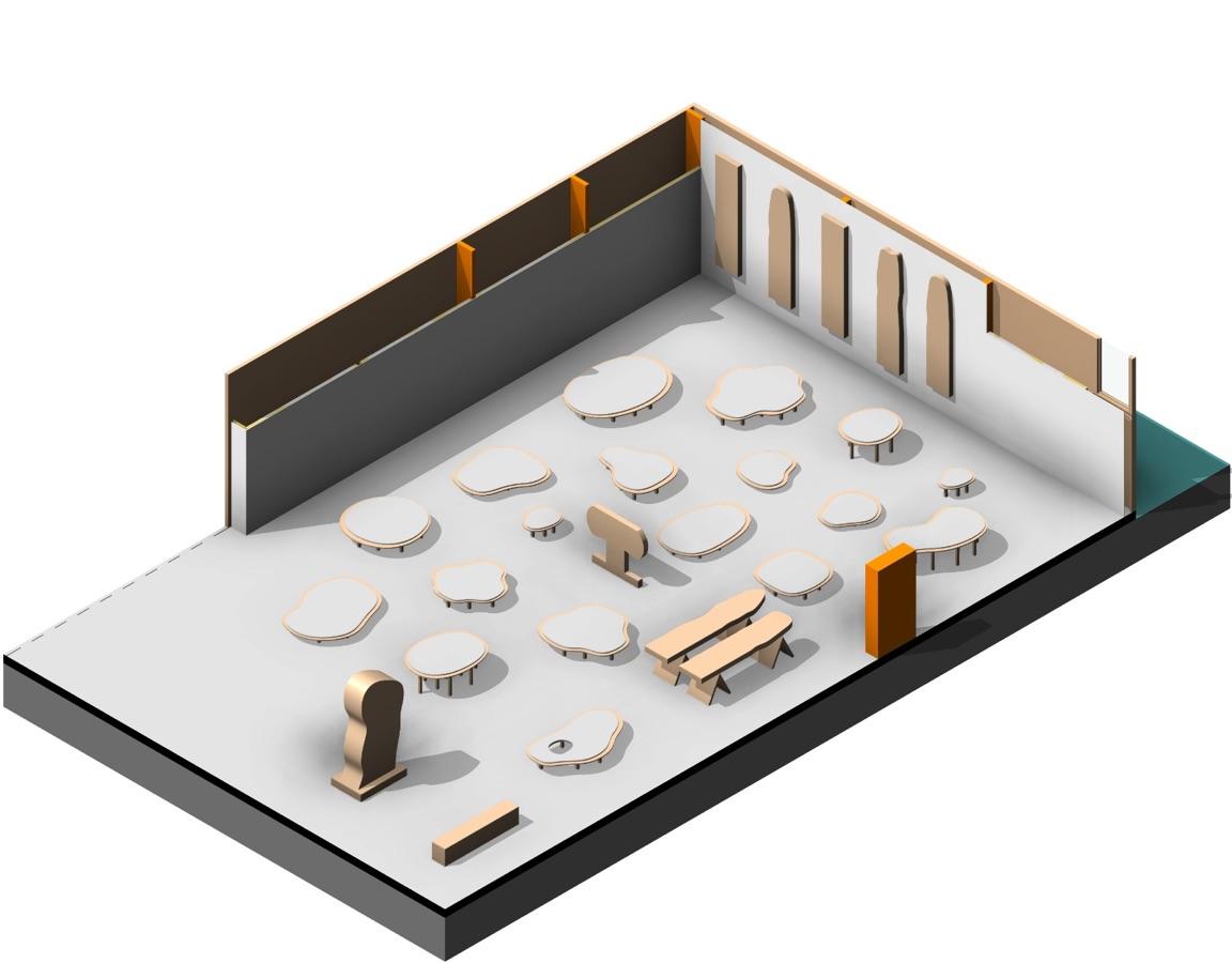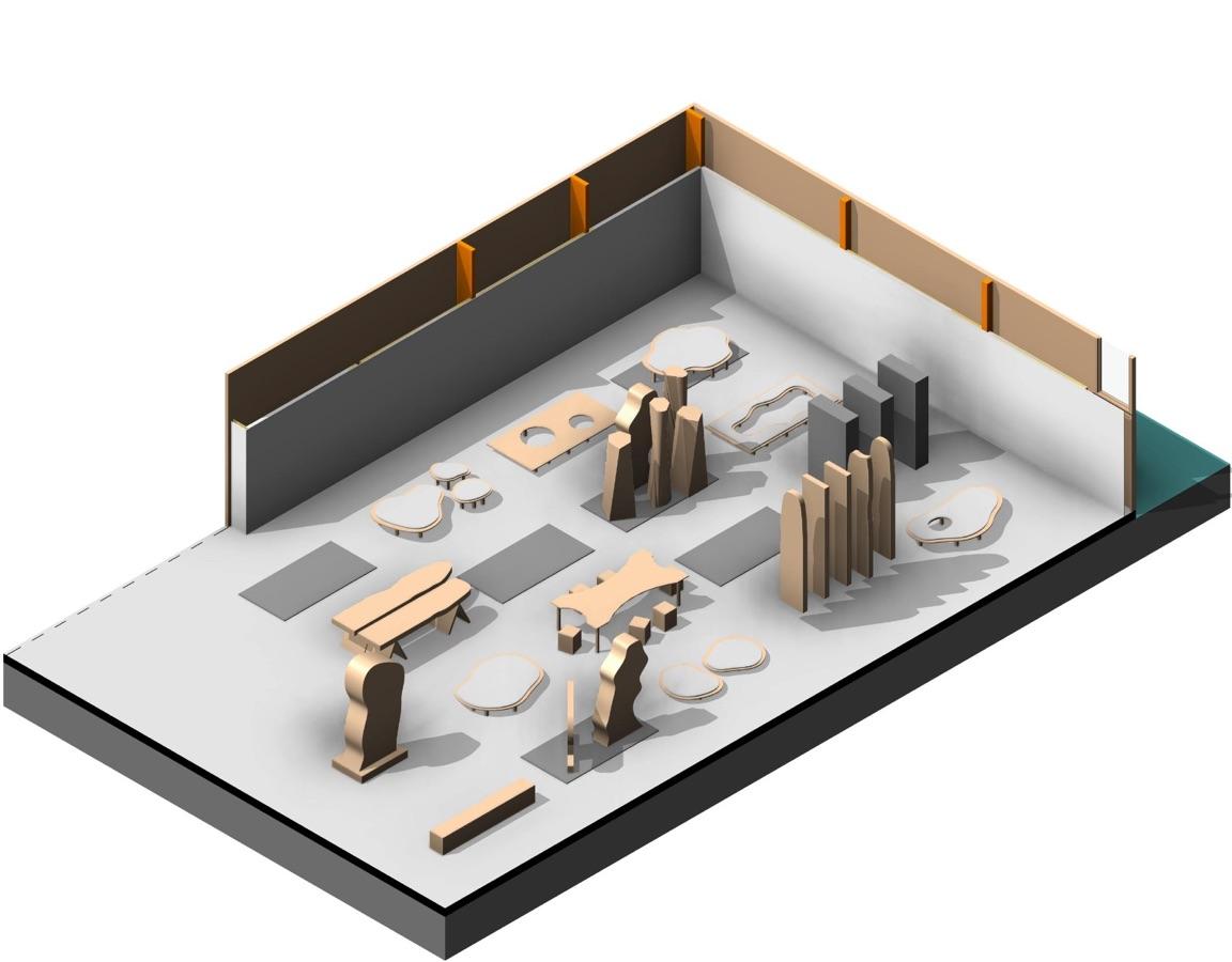 Este estudio de diseño espacial y expositivo constituye una fase esencial del montaje, asegurando que la colección Solum Donas sea presentada de manera óptima.