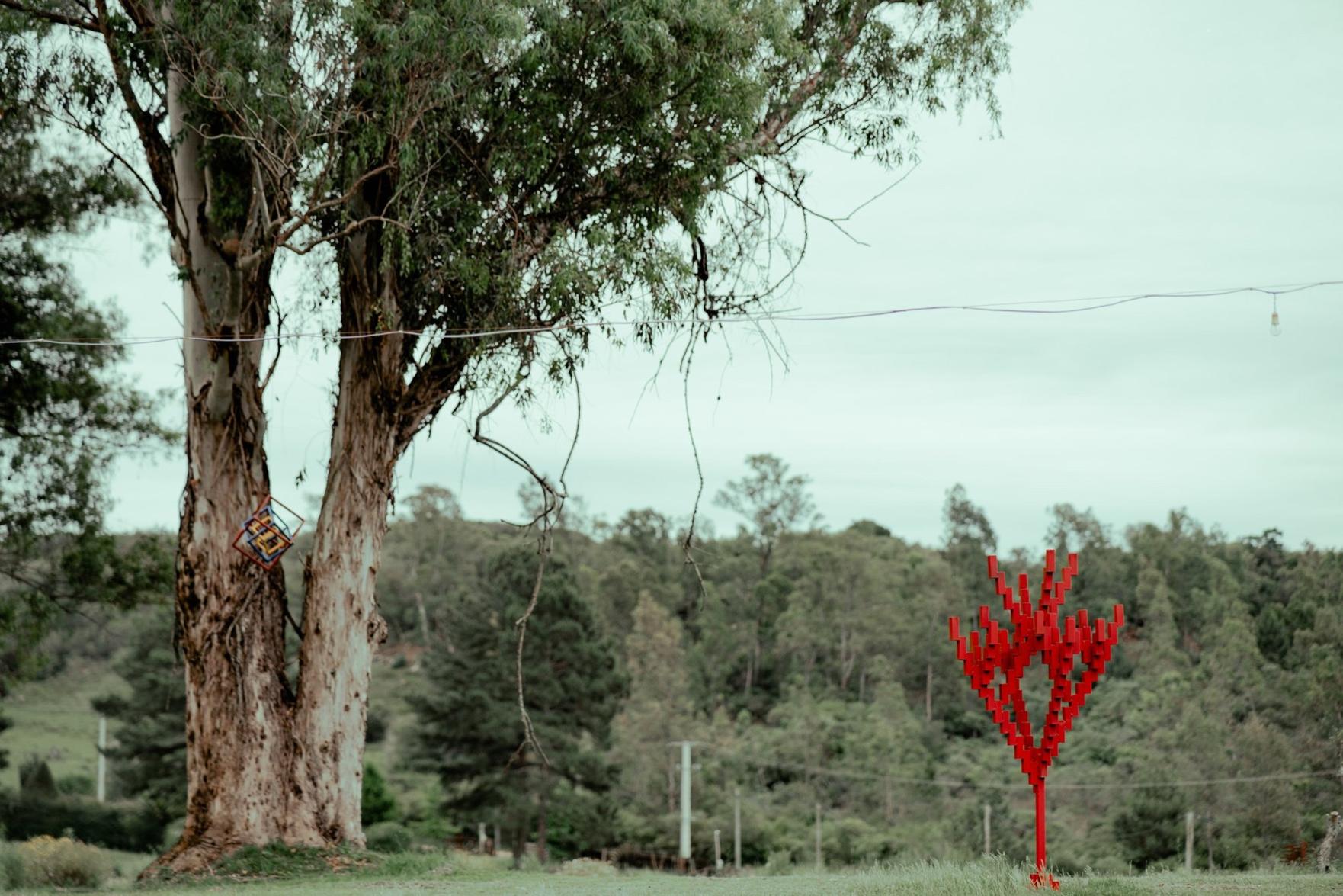 Destacando por su color vibrante y su presencia en el entorno, la obra actúa como un punto de referencia dentro del parque, estableciendo un diálogo entre lo natural y lo construido. A través de planos, líneas y vacíos, la escultura sugiere la silueta de un árbol que se reinventa desde la mirada contemporánea.