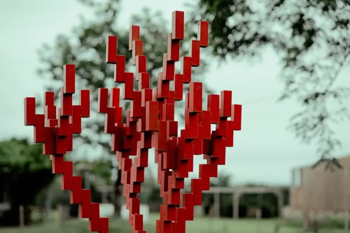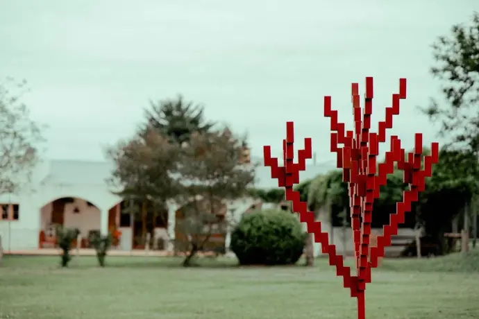Árbol Rojo es una escultura metálica pintada de rojo que toma la forma de un árbol estilizado. Su estructura geométrica y el tratamiento del volumen remiten a un lenguaje escultórico que explora la abstracción y la esencia de la forma más allá de la representación literal.