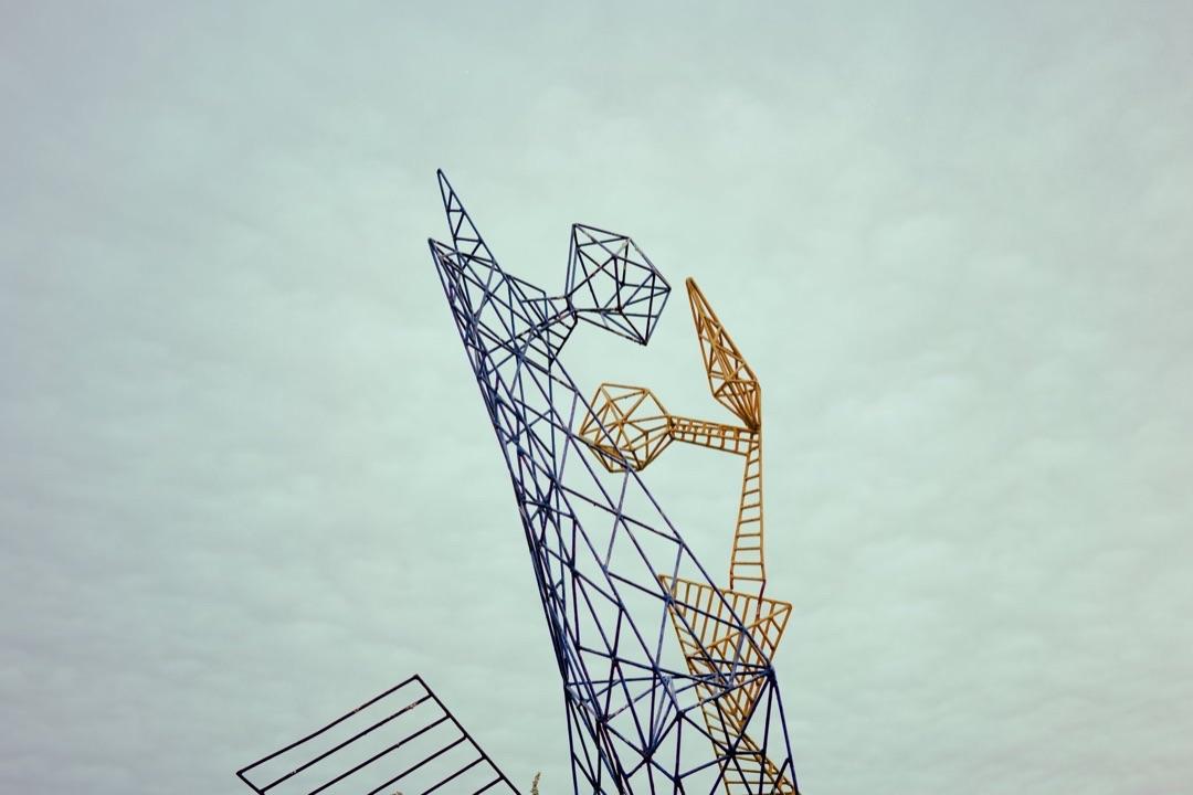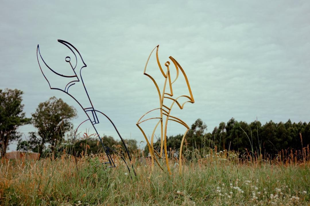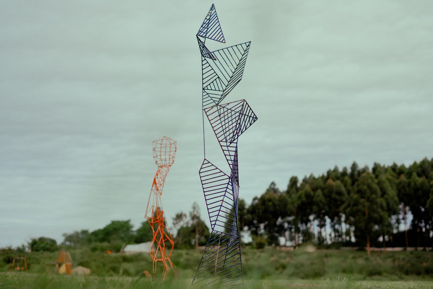 El uso del metal como soporte y su estructura abierta permiten que el entorno natural se funda con la obra, estableciendo un diálogo entre vacío, luz y materia que convierte el paisaje en parte del dibujo.