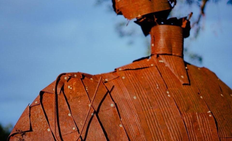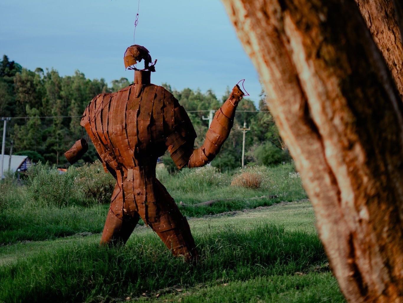 Hombre de Lata es una escultura de gran escala que representa una figura humanoide construida a partir de láminas metálicas recicladas. Creada por Solum Donas, la obra se erige como un cuerpo fragmentado, una piel de metal que evidencia el paso del tiempo y la transformación de la materia.