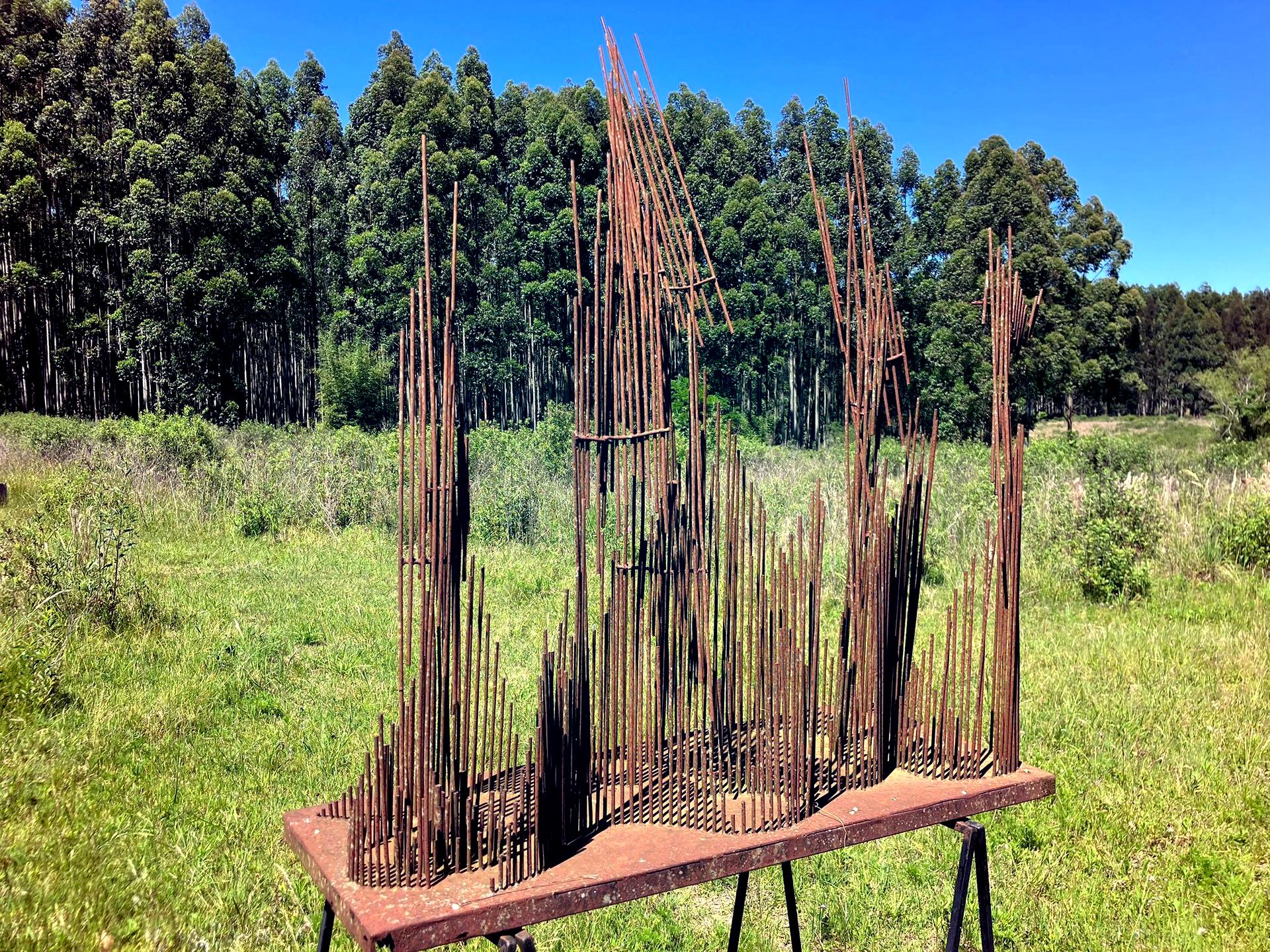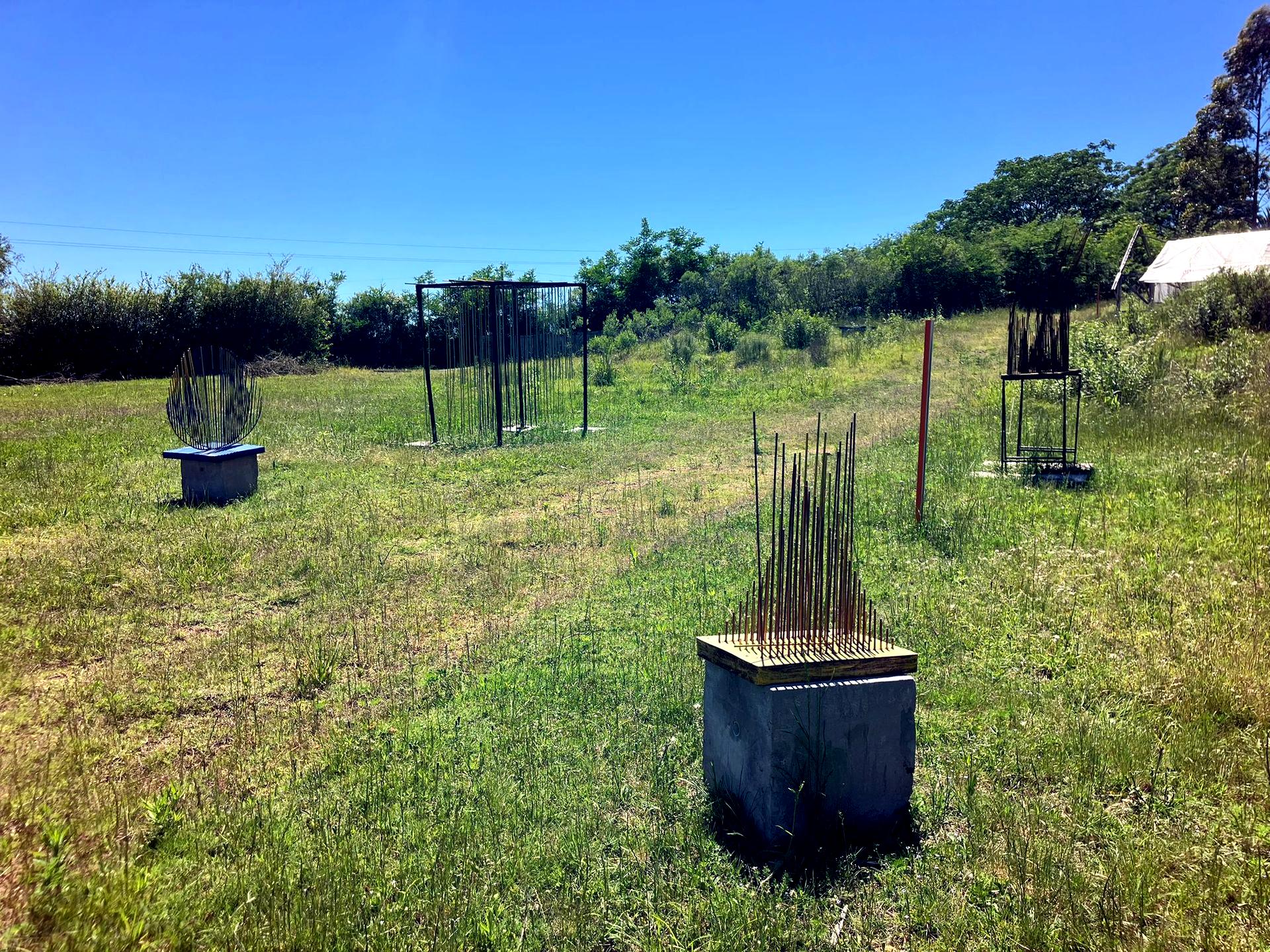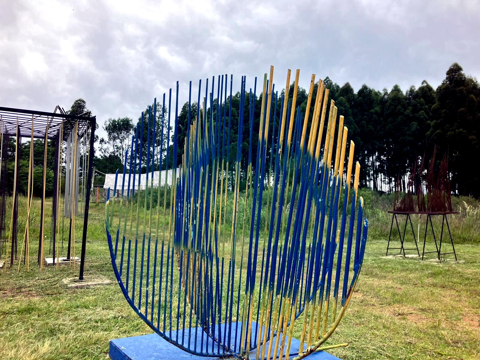 La Instalación Sonora está conformada por un conjunto de estructuras metálicas que producen sonido al interactuar con el entorno y con el movimiento de quienes la recorren.