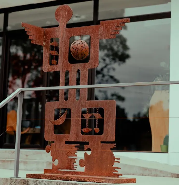 Los Seres del Horizonte son un par de esculturas metálicas gemelas y opuestas que flanquean la escalera de acceso a la recepción del MUMA. Con los brazos extendidos, parecen dar la bienvenida a quienes llegan, convirtiéndose en figuras simbólicas de encuentro y tránsito.