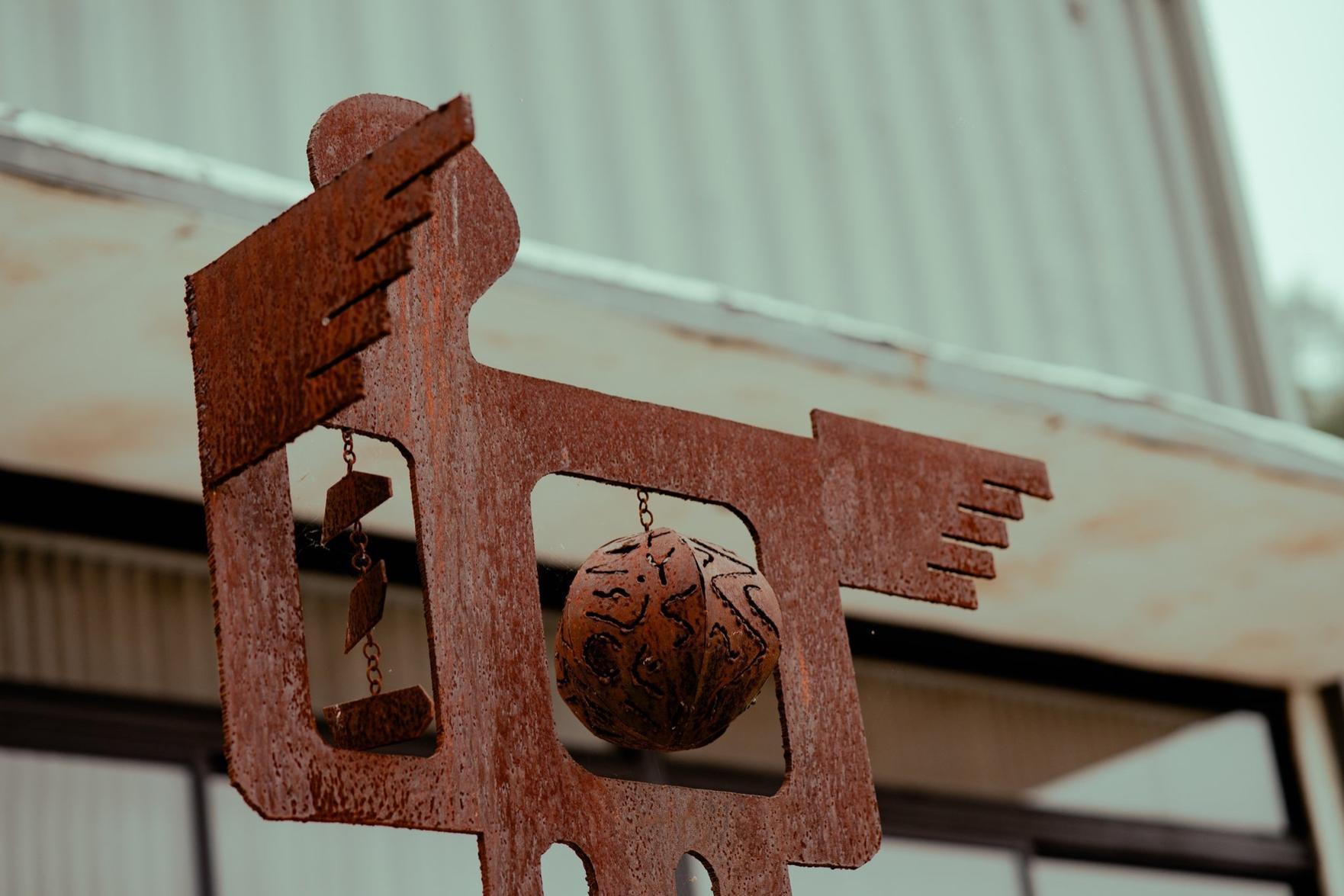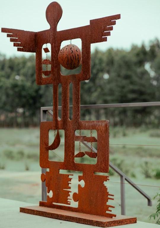 Su composición combina formas geométricas y recortes que equilibran la solidez del metal con una sensación de liviandad y movimiento, estableciendo un diálogo entre peso, vacío y horizonte.