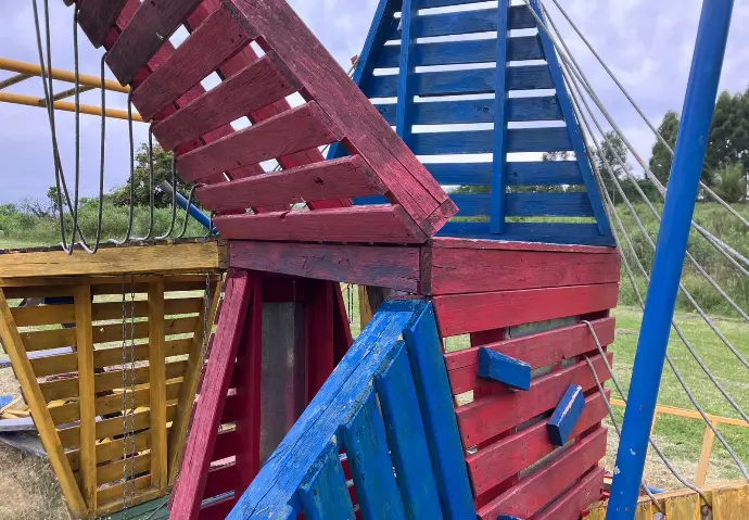 El diseño combina superficies inclinadas, redes, plataformas y elementos de escalada, que invitan a la interacción física, la curiosidad y la creatividad en su uso.