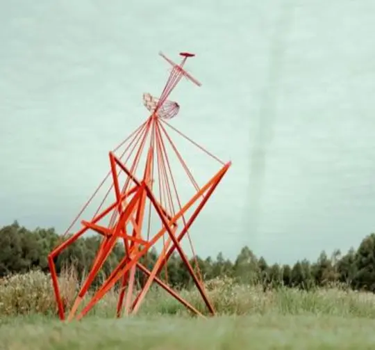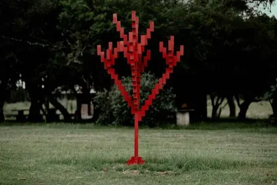 Escultura metálica de formas geométricas y color vibrante que representa un árbol estilizado, explorando la relación entre lo natural y lo construido en el paisaje.