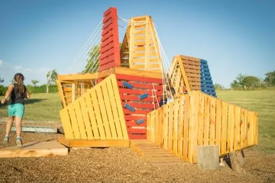 Espacio compuesto por módulos de madera reconfigurables, diseñados para el movimiento, la exploración y el juego libre, integrando el entorno y la creatividad en su uso.