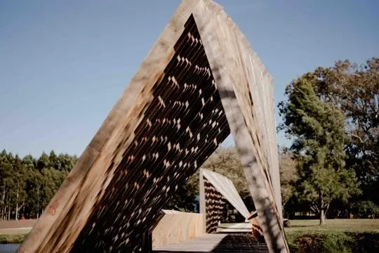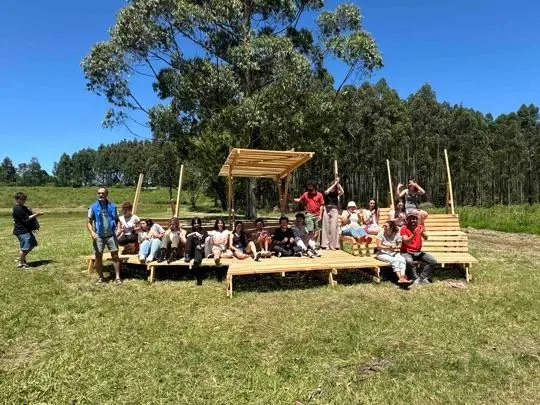 Espacio multiuso construido con cortes de madera del monte de eucaliptos circundante, donde el arte y la arquitectura se vuelven práctica comunitaria.